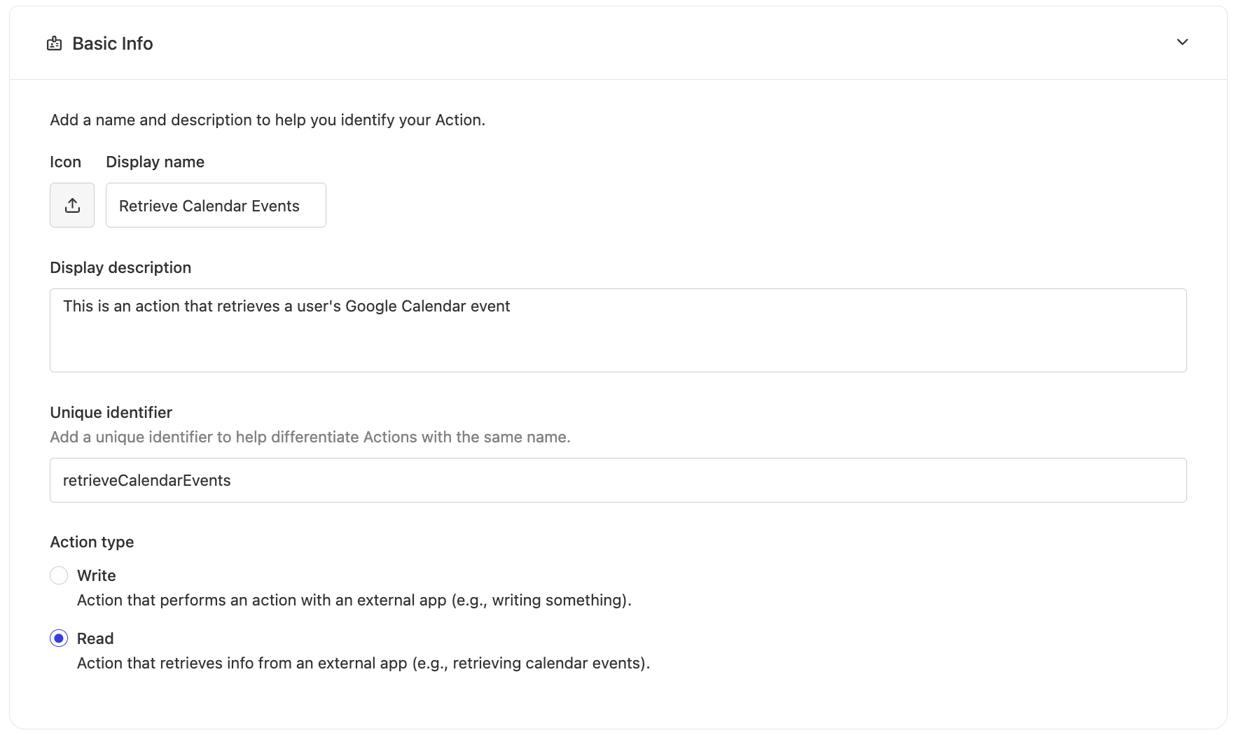 • Display Name: Choose a clear, descriptive name (e.g., "Calendar Events Retrieval")